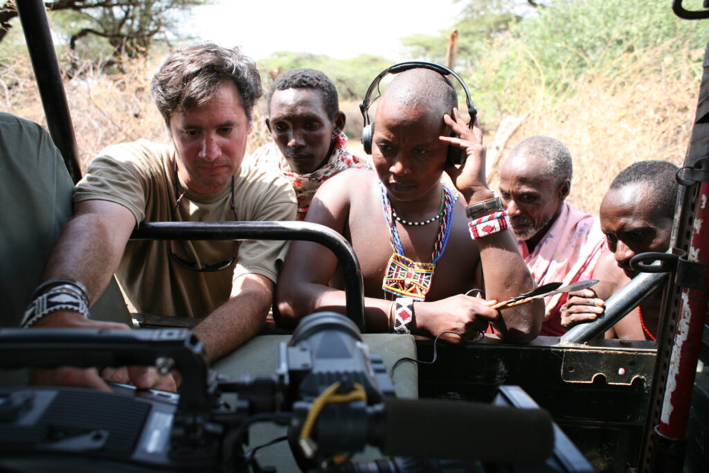 David E. Simpson (left) reviews footage with James Ole Kinyaga and other Maasai tribe members.