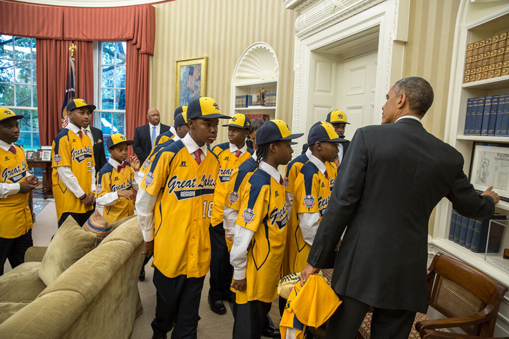 President Barack Obama shows a program for the Martin Luther King Jr. March on Washington to the Jackie Robinson West All Stars during the team’s visit to the Oval Office, Nov. 6, 2014. (Official White House Photo by Pete Souza)